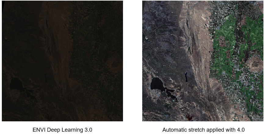 ENVI Deep Learning will apply an automatic visual stretch to data, just as ENVI does when you open imagery. For non-byte data, automatically applying the stretch will significantly improve the visual contrast for images and the ability of deep learning models to detect features.
